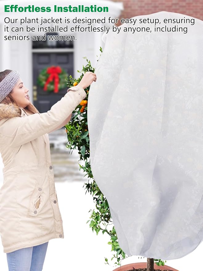 • These durable frost covers for outdoor plants feature a sturdy zipper for easy wrapping around larger plants. No need for full removal when checking on them. The bottom drawstring allows for a snug fit, blocking out cold air while keeping plants cozy and warm, even during icy nights.
