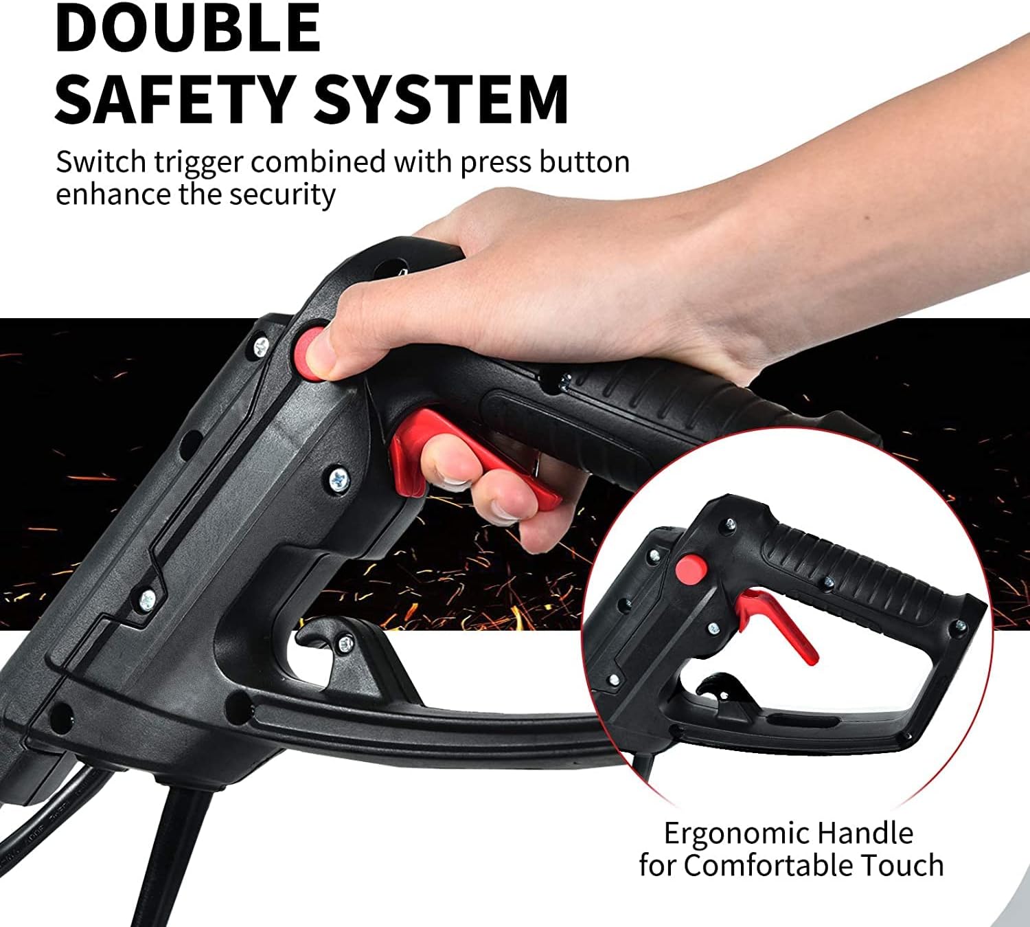 • Double Safety System: In order to ensure safety during use, our electric garden tiller is equipped with an on/off trigger and push-type safety button. The double safety system is more secure. In addition, the sturdy and wide protective shield can prevents sand and stone splashes from hurting people and play a very good protective role.