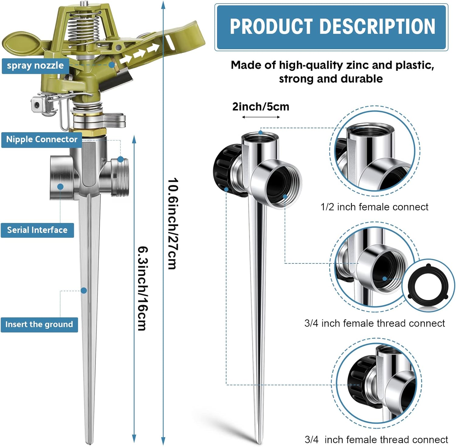 • Large Area Coverage: the lawn sprinkler garden sprinkler is suitable for 1/2 inch thread head, featured with 360 degree rotation, watering up to 79 feet in diameter; The water sprinklers can be applied in series which is very suitable for wide area irrigation; Please increase the water pressure before connecting the impact sprinklers in series
