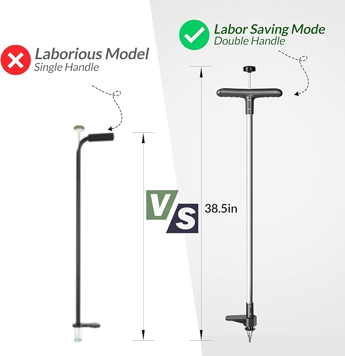 • Standup Weeding Tool For a Better Gardening Experience: Get rid of weeds without risking your back with this long handled lawn weeding tool. The 38” tall handle lets you uproot the weeds without having to bend over or go down to your knees. The foot pedal lets you put enough force on the gardening weed extractor to penetrate the ground and grab the whole weed, including the roots, so it doesn’t grow back. It is good tools for your garden, backyard, frontyard landscaping.