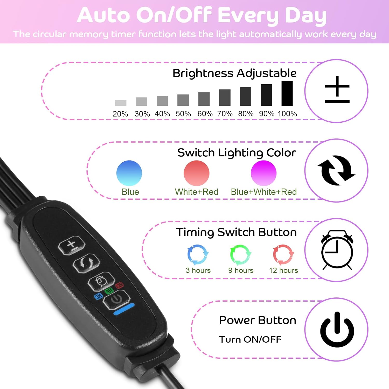 • Circular memory timing function: Our plant lights for indoor growing can automatically turn on / off for 3/9/12H every day based on your settings