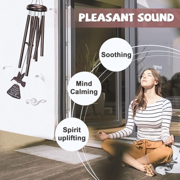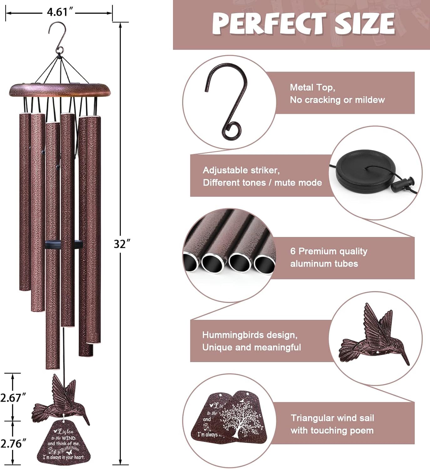 • High Quality Materials : Remembrance wind chimes for outside, not only have a bronzed look, also the textured bronze finish with the tree of life image and text embossed in white. Beautiful made, constructed with exquisite Hummingbird, a metal top, durable nylon rope, anodized aluminum tubes and a sturdy S-shaped hook, these memorial wind chimes are corrosion/rust/wear resistant. The decent sympathy gift and also a unique outdoor decor.