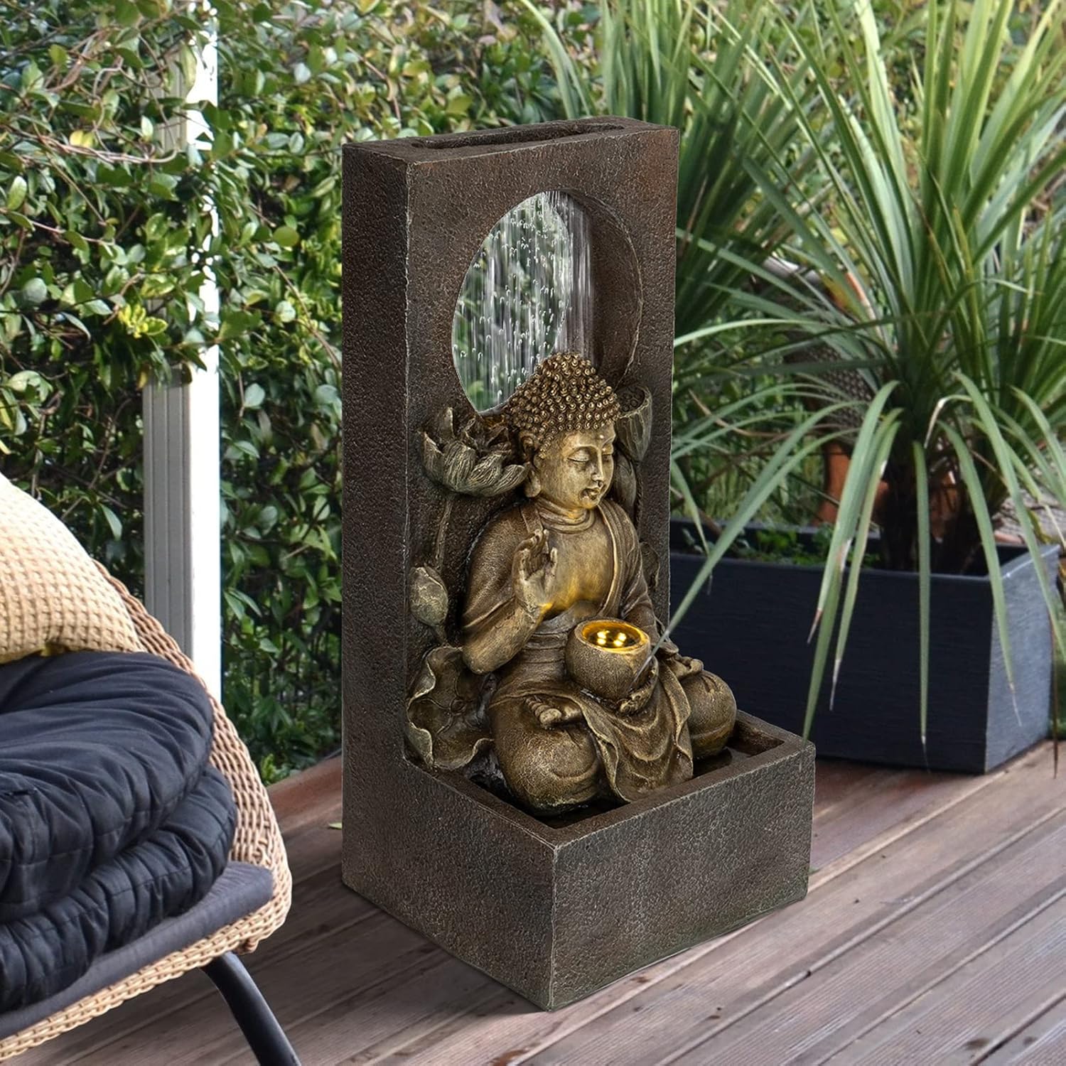 • Zen-Inspired Buddha Fountain Elevate your outdoor space with this Ferrisland Buddha Waterfall Fountain, featuring a serene Asian Zen design. Perfect for patio, garden, or backyard decor, its gold finish and intricate details create a peaceful ambiance. The gentle water flow enhances relaxation, making it a great Fengshui decor piece.