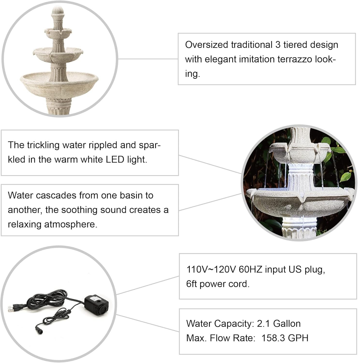 Glitzhome Outdoor Fountains and Waterfalls 3 Tier Patio Fountain with Pump & LED Light, Resin Terrazzo Water Fountains Oversized Outdoor Floor Stand Fountain for Garden Backyard Yard Lawn Sand Beige