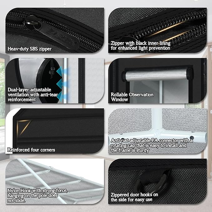 • Easy to Assemble---Growing tents are simple and fast to install without any tools even if you've never done something like this before. The package includes the user-friendly and professional instruction well.