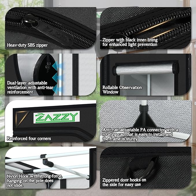 • Top-Quality Materials and Sturdy Frame---Zazzy plant grow tent made of superior quality reflective 600D mylar and double stitched to ensures the light blocking. Heavy duty all steel poles which are rated to handle at least 110 lbs. The frame is specially finished to ensure smooth installation and safe handling.
