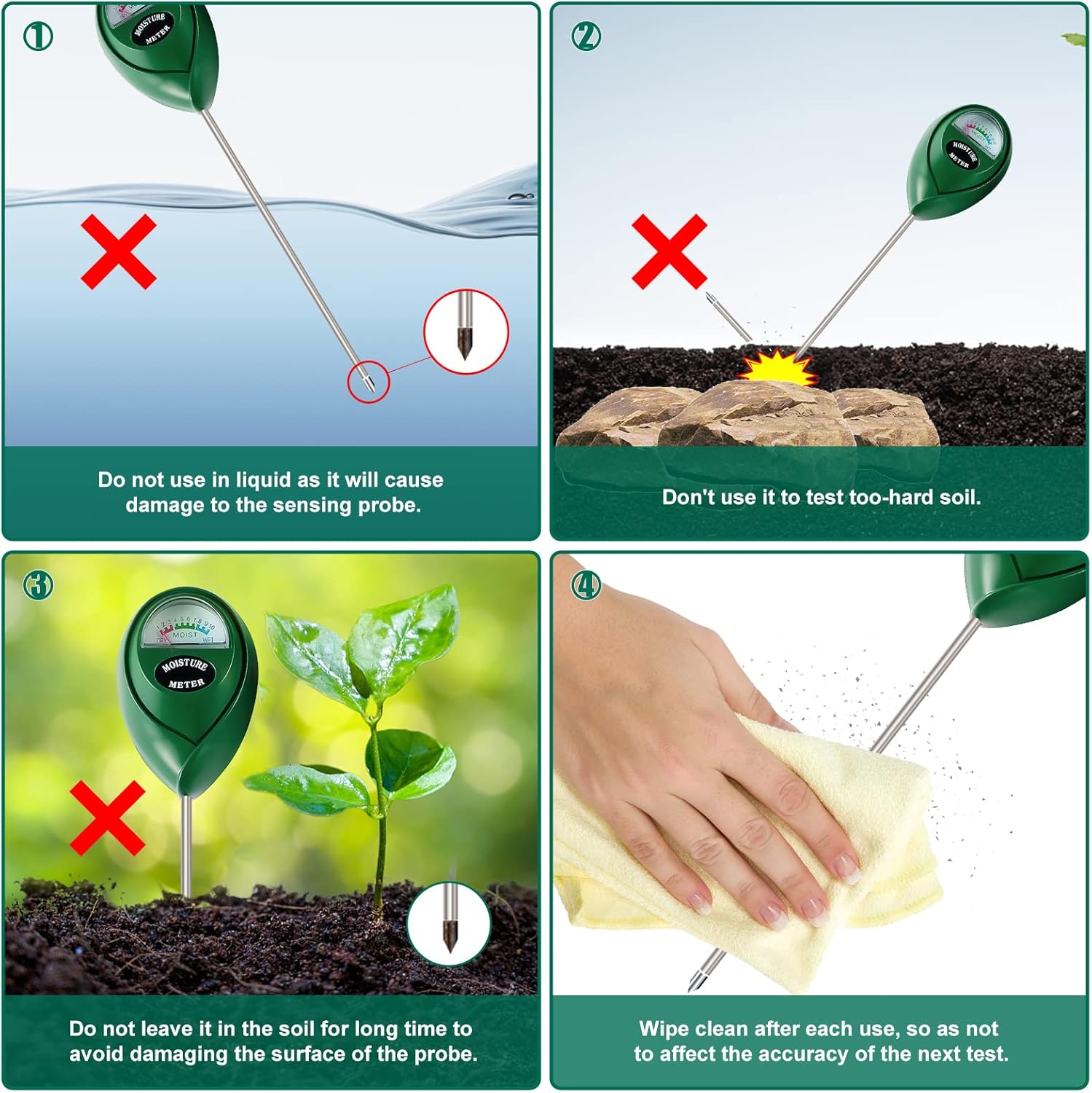 • IMPORTANT TIPS:1.Do not use in liquid as it will cause damage to the sensing probe. 2. Don't use it to test too-hard soil. 3. Wipe clean after each use, so as not to affect the accuracy of the next test.