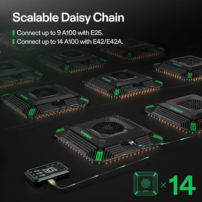 • Integrated Circulation Fan: The centrally located circulation fan in the LED balances airflow where other fans cannot reach, allowing more air to enter the canopy directly; To unlock additional features, the fan must be used with the Vivosun Growhub Controller (E42A/E25), available for separate purchase