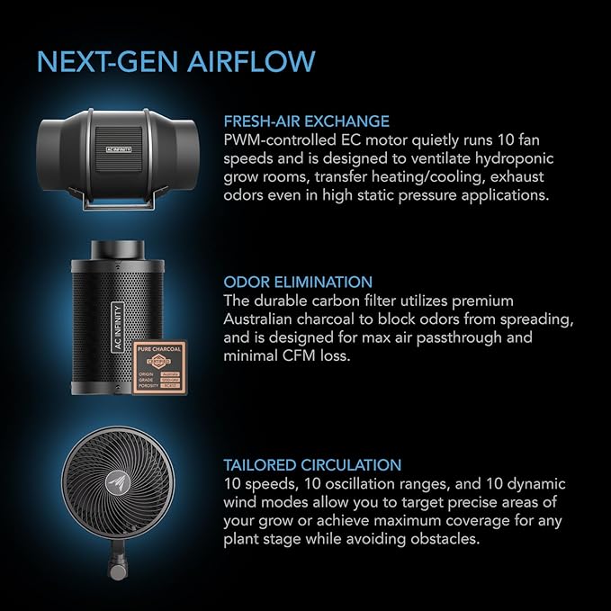 • EC inline fan 4”, oscillating clip fan 6”, and 2x2 full-spectrum grow light with Samsung LM301H LEDs.