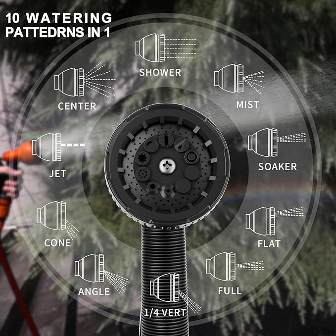 • TEN PATTERNS MEET ALL YOUR WATERING NEEDS: Its multiple functions are clearly marked and simple to switch. The spray nozzles for garden hose has ten different spray patterns for various uses. The spray ways of this hose nozzle sprayer heavy duty include full, center, jet, mist, shower, soaker, cone, angle, flat, and 1/4 vert. You can change the stream and strength of the water, for plants, garages, pets, water plants, etc