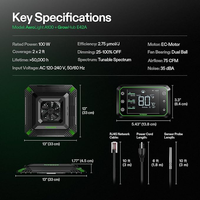 VIVOSUN 2X AeroLight A100, Tunable Spectrum, LED Grow Light 100W with Integrated Circulation Fan & Growhub Controller E42A, Compatible with App & E25, 2 x 2 Ft. Coverage