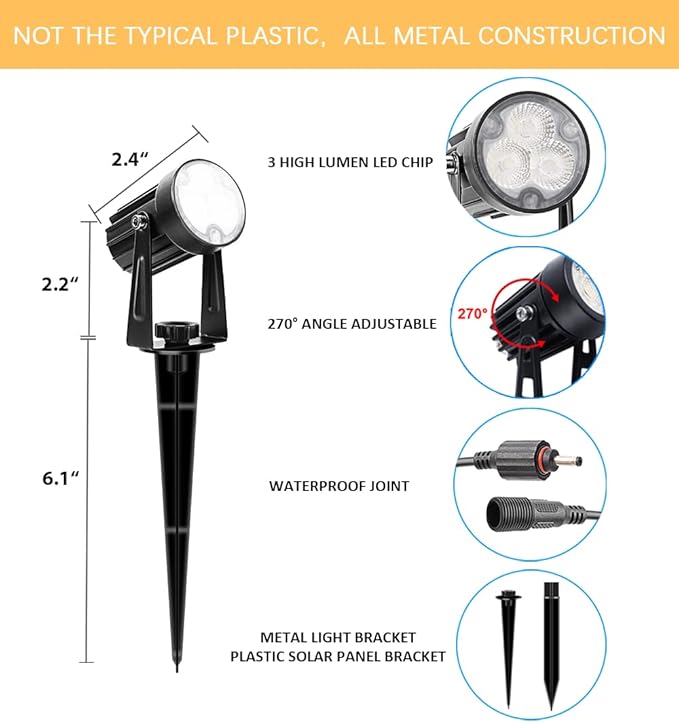 • 【2 installation methods】Easy to install:The solar panel and outdoor solar landscape lights can be installed in the ground or mounted on the wall with included screws. Each solar garden spot lights with 118inch/3m cable, 270° Adjustable freely up or down to meet different requirements