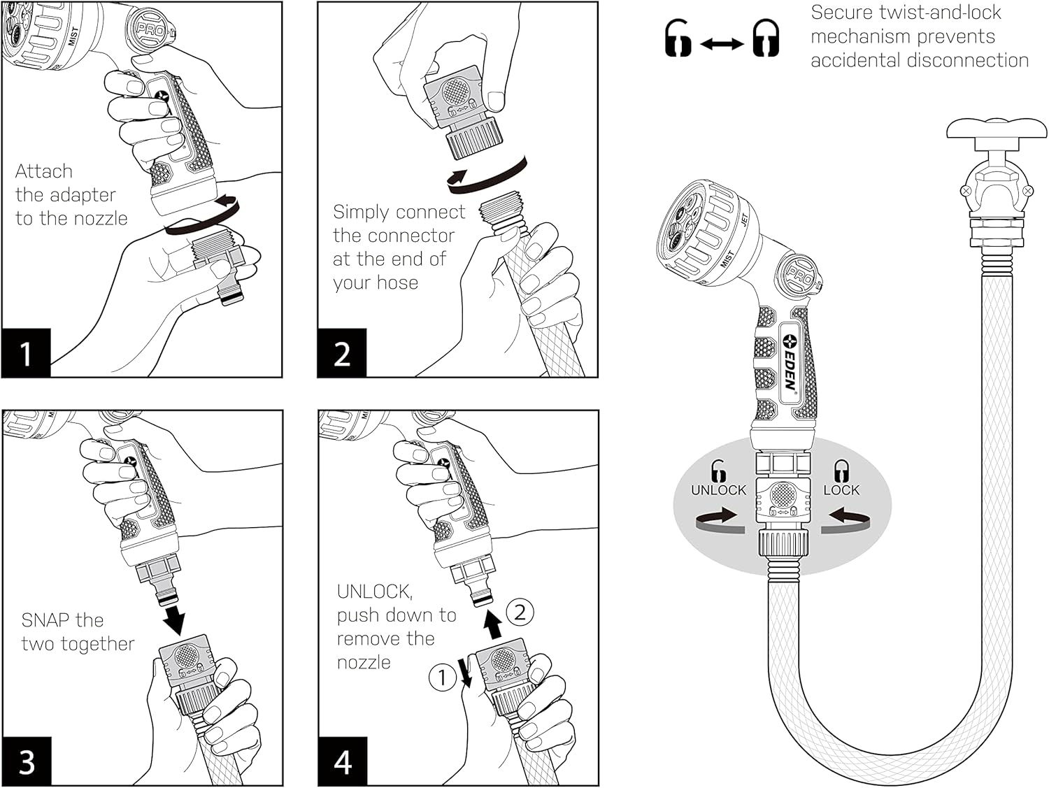 • Quick Connect Starter Set for quick connection and disconnection fits standard U.S. garden hoses and watering tools. The secure twist-and-lock mechanism prevents accidental disconnection and water stop feature allows tool changes with the water on.