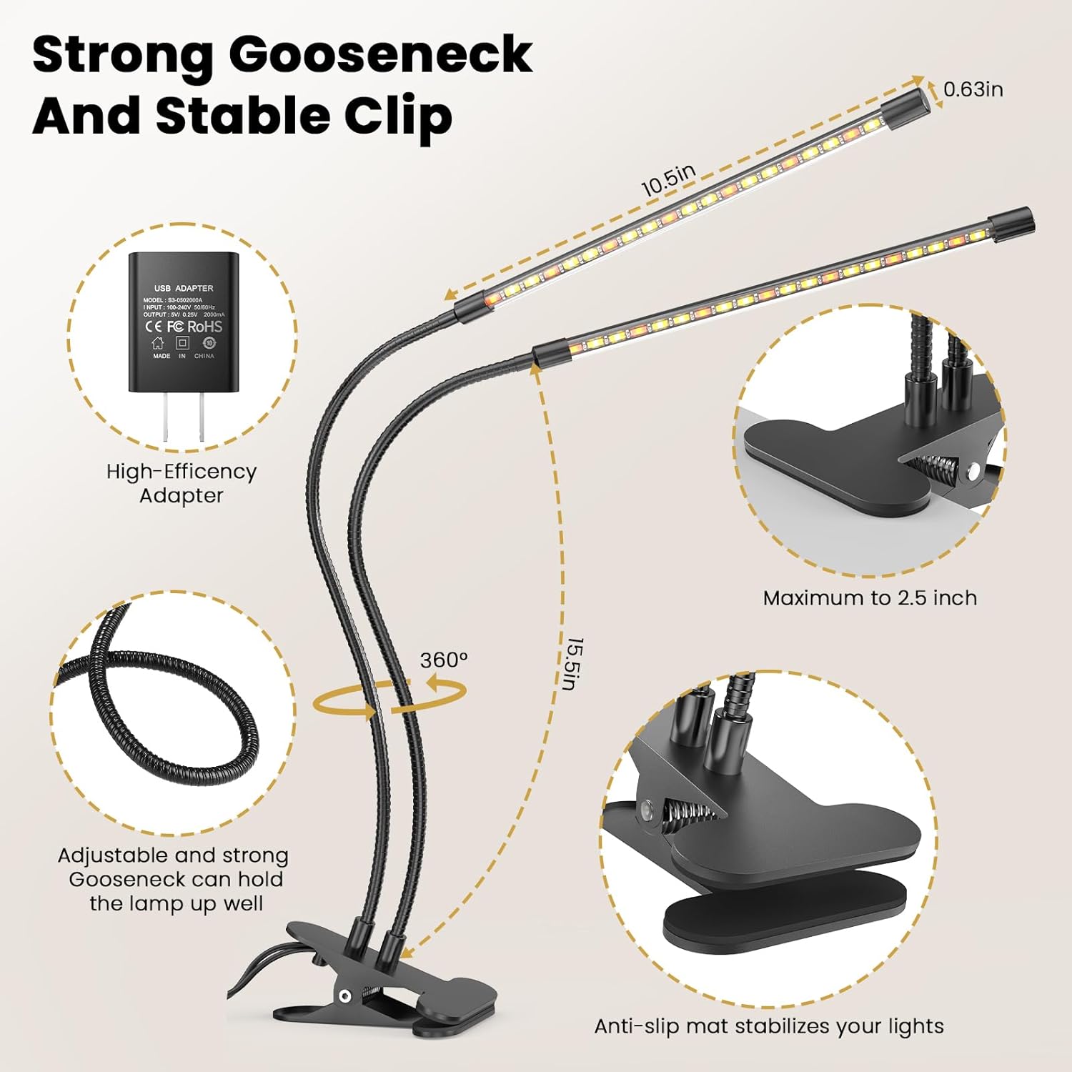 • Larger Lighting Area: 120°beam angle 2-head clip on grow light, equipped with flexible gooseneck and rotatable bulb.