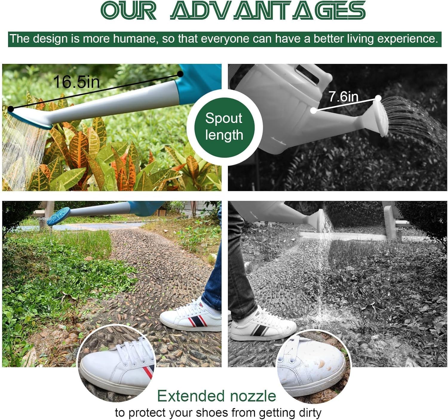 • Easy Watering: Plant watering can has a removable 16.1-inch long spout, easy to carry and store, when installing, pass the connector through the spout and screw tight, seals well with no leak. Long spout watering can easy to reach distant plants, watering easily without splashing or wasting water, it easy to control the overall water flow, directing water exactly where it is needed, allowing every part of the plant to fully absorb the water .