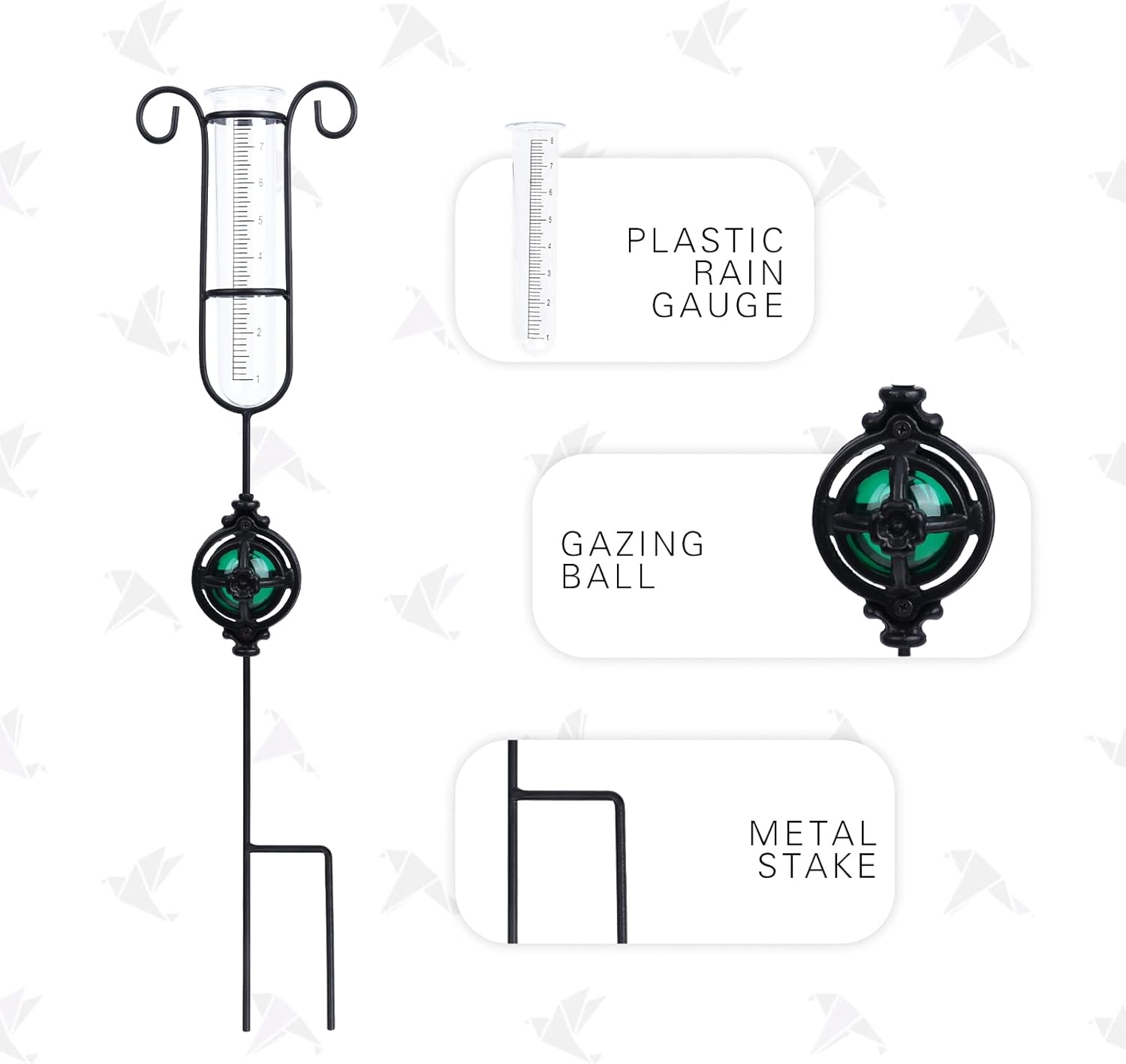 • Beautiful gazing ball sits underneath the rain gauge, measure rainfall while adding beauty and unique style to your garden