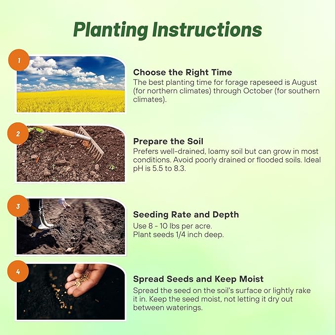• ADAPTABILITY TO VARIOUS CLIMATES & CONDITIONS: This brassica rapeseed is heat, cold, and drought-tolerant, making it suitable for USDA Zones 5-9. It retains leaf and stem quality in frost and cold conditions, providing reliable forage during autumn and winter. Its adaptability makes it perfect for creating durable outdoor food plot and pastures that can withstand harsh weather.