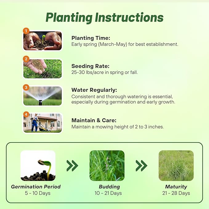 • EASY TO ESTABLISH & MANAGE: With a fast germination rate and a recommended seeding rate of 25–30 lbs per acre, our forage fescue fast growing grass seeds is easy to plant and maintain, helping farmers create durable, high-performing pastures with minimal effort.