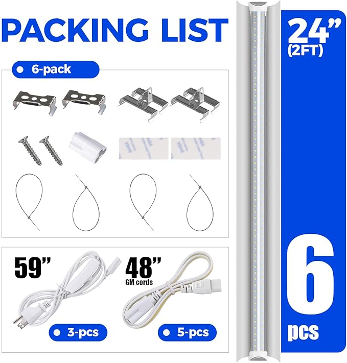 • What You Get: 6 x Barrina Plant Grow Light Bulbs, 3 x Power cords with ON/OFF switch, 5 x Connecting Cords(48''), 6 x Small Connectors, 24x Installation Clips, 12 x Tapes, 24 x cable ties