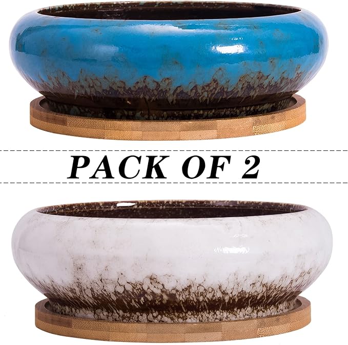 ARTKETTY Succulent Pots - Large Succulent Planters with Drainage, 7.3 Inch Ceramic Bonsai Pots with Bamboo Tray Set of 2, Shallow Cactus Flower Planter Bowl for Indoor