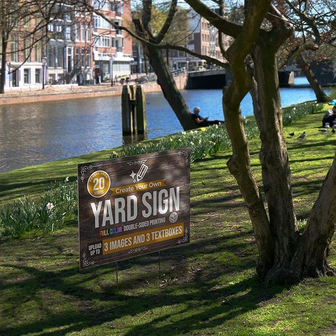 • Be creative with your customizable sign - You can upload up to 3 images and textboxes for your personalized yard sign. Choose from 20 fonts and have your sign printed in full color on the front and back. These personalized yard signs come in 10 packs.