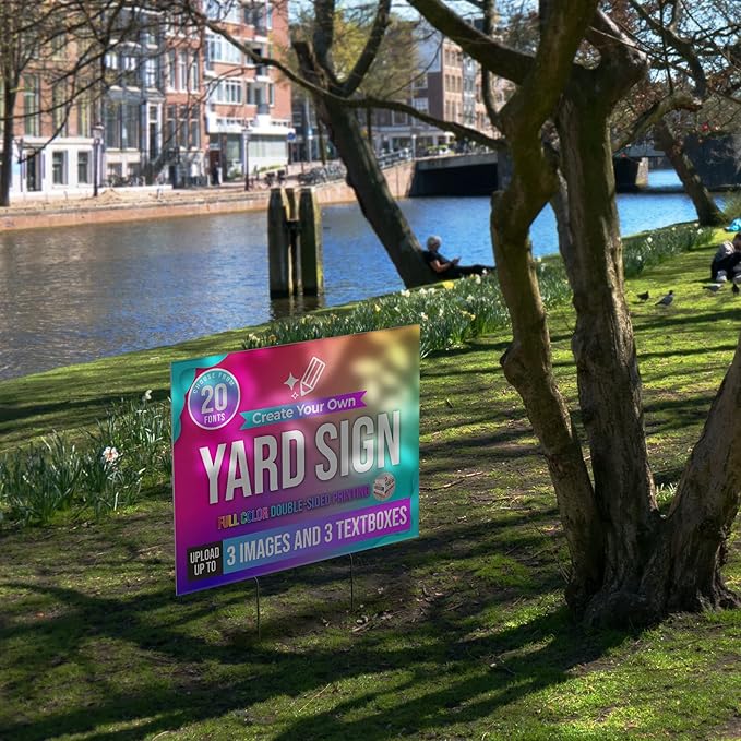• Be creative with your customizable sign - You can upload up to 3 images and textboxes for your personalized yard sign. Choose from 20 fonts and have your sign printed in full color on the front and back. These personalized yard signs come in 10 packs.