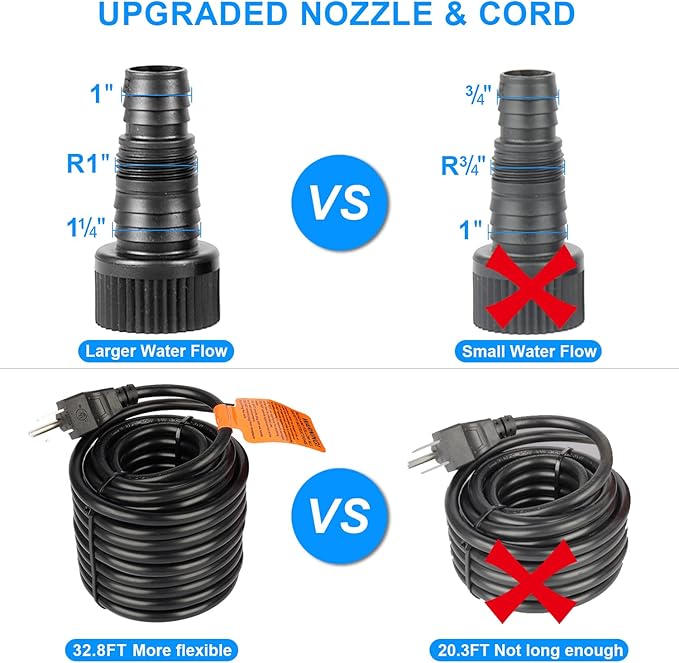 - 【Smarter &Quieter】-EASY INSTALLATION: It is AMPHIBIOUS, not only a outdoor 100W 1800-gph pond waterfall pump (New upgaraded quieter&powerful pond submersible pumps for outdoor ponds) but also can be used on dry land for more applications.With 32.8 feet SUPER LONG CORD, it can meet a variety of distance requirements.The 100W 1800-gph pond waterfall pump for outdoor ponds comes already assembled. All you need to do is just to place it in 100W pond water-fall pumps and plug it in, which is so easy.
