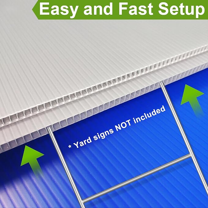 • Easy to Use: It only takes seconds to install, no additional tools are required, just slide in your yard signs, then step on the mid-section of the H frame to push the stake into the ground. Works well with 5mm or 6mm corrugated plastic signs. (Notice: Yard Signs NOT Included In the Package)