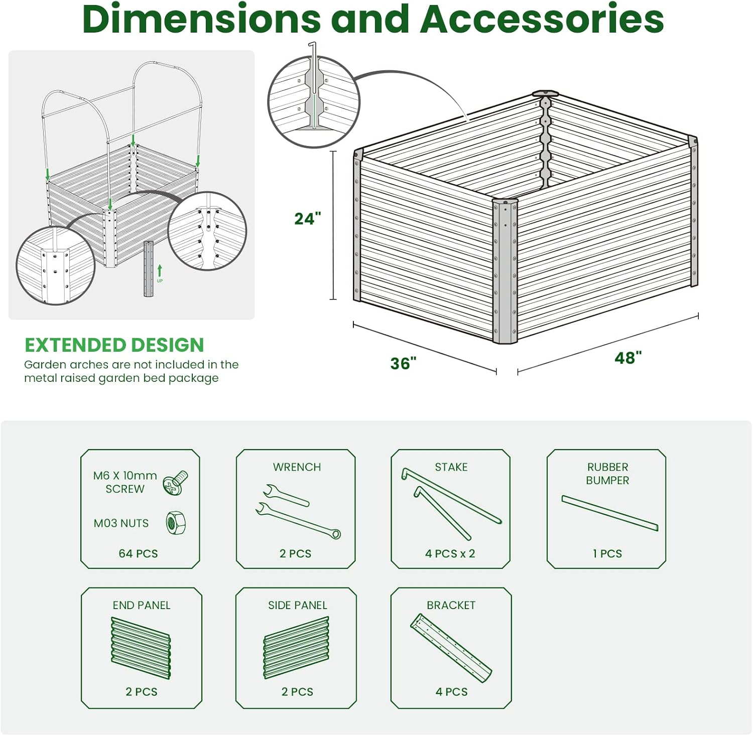 • Size Options: Our raised garden beds are available in 3 sizes and 2 colors to choose from. The sizes are: 48"x 36"x 24", 72"x 36"x 24, and 96"x 48"x 17". In addition, our garden bed is made with environmental friendly materials that can be recycled. Create your dream garden with Savana's space saving galvanized raised garden bed and start growing all your favorite vegetables, fruits, herbs, and seasonal flowers today!