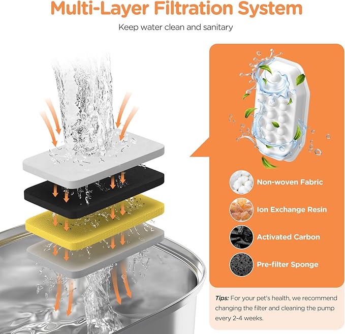 - ๐พใQuadruple Filtration SystemใCat fountains is equipped with an activated carbon filter, which consists of cotton layer, activated carbon, and ion exchange resin, forming a triple filtration system. It can remove odor and soften water. Meanwhile, the filter sponge captures pet hair, dirt, and food particles, providing your pet with pure and healthy water.