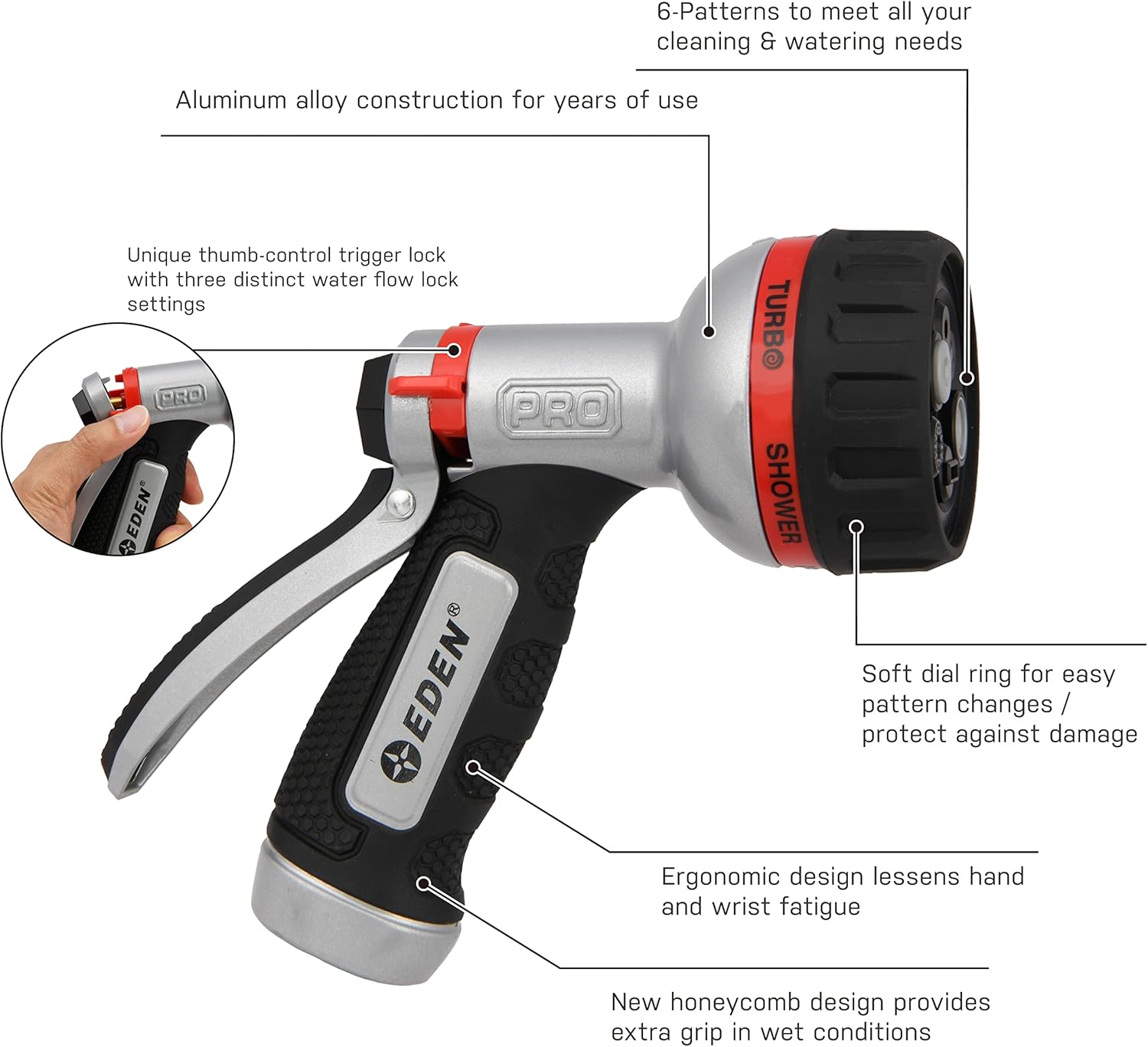 Eden PRO 94830 Metal Rear Trigger 6-Pattern Turbo Nozzle, Heavy Duty Hose Sprayer for Garden, Plants, Lawns, Quick Connect Set Included
