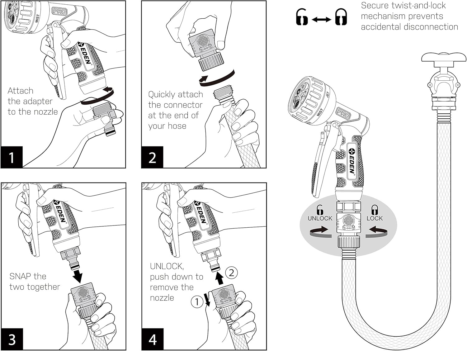 • Quick Connect Starter Set for quick connection and disconnection fits standard U.S. garden hoses and watering tools; the secure twist-and-lock mechanism prevents accidental disconnection and water stop feature allows tool changes with the water on