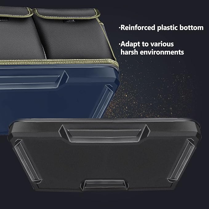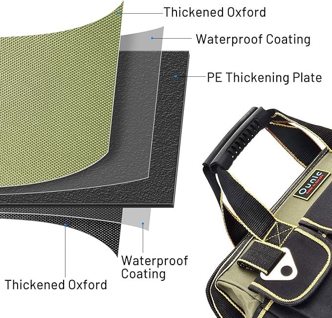 • 【Sturdy and Durable】- The tool bag is made of high-quality Oxford cloth (five-layer synthesis: Oxford cloth, waterproof layer, PE thick plastic board, waterproof layer, Oxford cloth) and reinforced with a PP plastic waterproof base, providing superior toughness, strength, resistance to dirt, and long-lasting durability, making it suitable for use in various harsh working environments