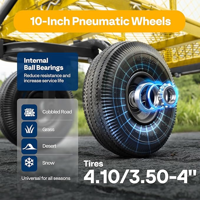 • NOISE REDUCTION TIRES - The load-bearing, shock-absorption, and noise- reduction of the cart are all determined by the casters; The pneumatic tires have good elasticity, impact resistance, and noise reduction; Compared with small wheels, large wheels are able to adapt to various road conditions and have good load carrying advantages; PLEASE BE AWARE that the tires are not fully inflated due to safe transport consideration