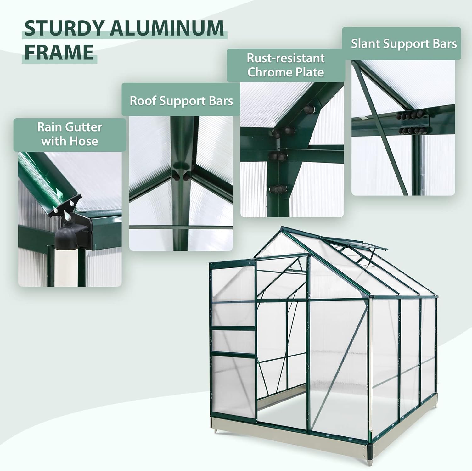 EAGLE PEAK 6x6x7 Outdoor Walk-in Hobby Greenhouse with Adjustable Roof Vent and Rain Gutter, Base and Anchor, Polycarbonate Aluminum Green House for Backyard Garden, Dark Green