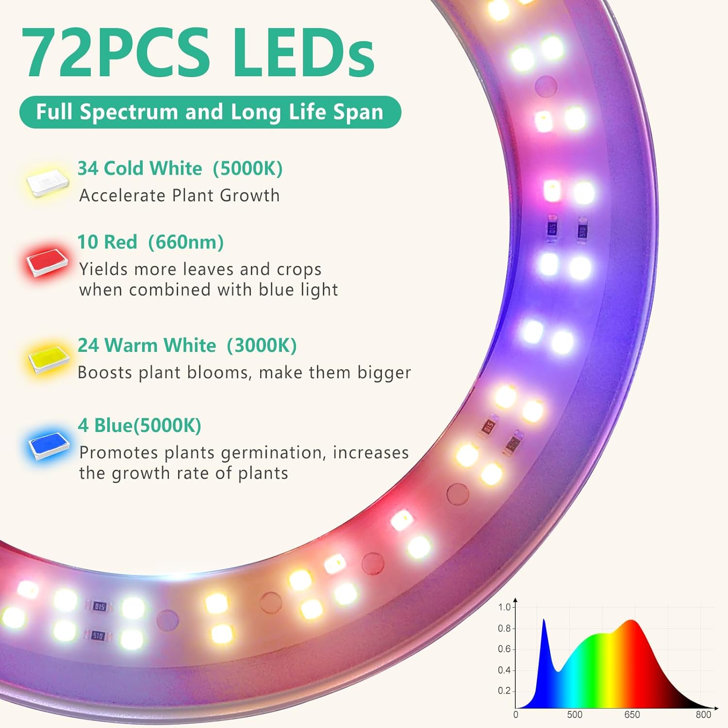 • LED Full Spectrum Grow Light: This grow light features 72 high-efficiency LEDs that emit a full spectrum of light (380nm-800nm), including white, warm white, red, and blue wavelengths. Designed to support the healthy growth of plants like succulents, herbs, and tomatoes, it is suitable for a variety of growth stages. Let your plants thrive with this versatile and efficient grow light.