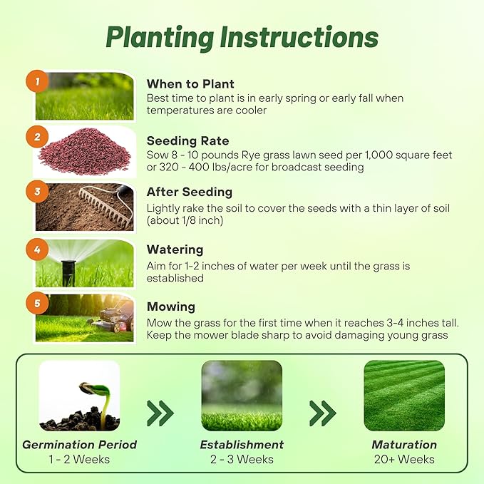 • PREMIUM RYEGRASS SEEDS: This premium 50/50 blend of Fireball and Hatrick ryegrass seed is engineered to deliver a lush, dark green, carpet-like lawn. The OptiGrowth coating is a standout feature, ensuring uniform seed distribution, enhanced soil contact, and superior moisture retention. This coating drives faster germination and more thicker and robust lawn establishment.