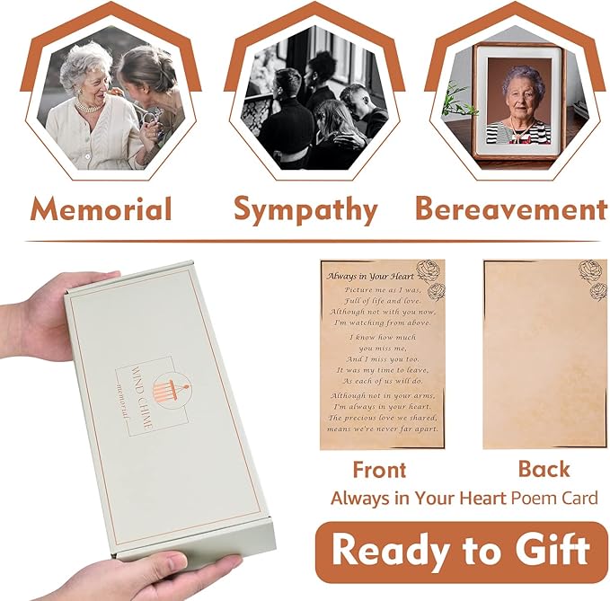 • Sympathy Wind Chimes: Do You Want to be Proud of the Sympathy Gift You Send? Our sympathy wind chimes are beautifully made with care and the unique sentiment says: "listen to the wind and think of me, I'm always in your heart." It is such a special and thoughtful gift for a grieving friend or family member, and sympathy wind chimes sound beautiful as well. It made them feel special that you cared enough to share in their grief in a more meaningful and personal way.