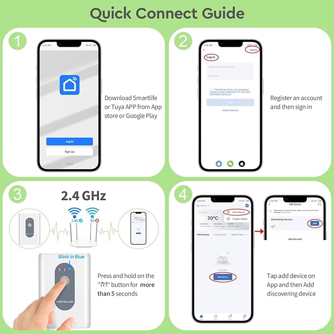 • Kindly Note: Only 2.4GHz WIFI can be connected ( not support 5G). For dual-band routers, please enable the 2.4GHz WiFi band independently, and the name is different from the 5GHz WiFi band. Available mobile phone system version: Android 5.0 or above, IOS10.0 or above