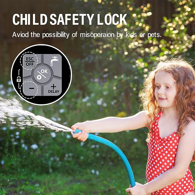 • 【Child Lock】The water timer for garden hose has a Child Lock setting that helps to avoid mistaken operation and make the timer safe from children activities.