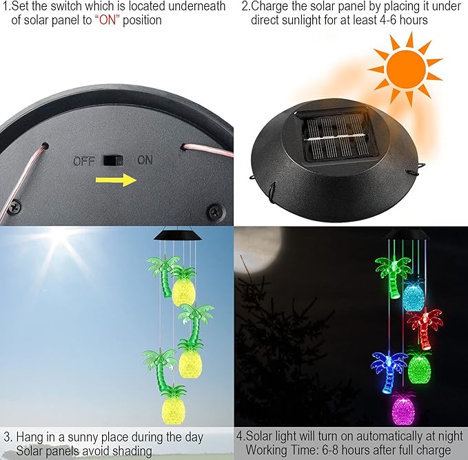 • SOLAR POWERED ENERGY SAVING: Solar powered, zero electricity bill. No wiring required or external power supply is required. You just need to hang him where you want to decorate. Full charged in direct sunlight for 6-8 hours. The solar wind chime lamp will automatically light up at night and change the color to create a romantic atmosphere effect. (Make sure the switch is in "ON" position. Switch: ON/OFF Under the panel)
