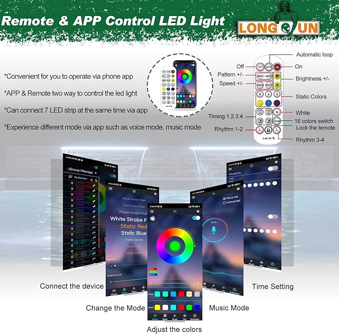• 【RF Control & APP Control Light】LONGRUN pool fountain light can be controled via remote or phone APP, which is conveniente your use. Once the remote broken, you can control the light via APP directly. And you can experience different mode via phone app, such as music mode, light style, voice mode etc. (APP can connect 7 LED strip at the same time)