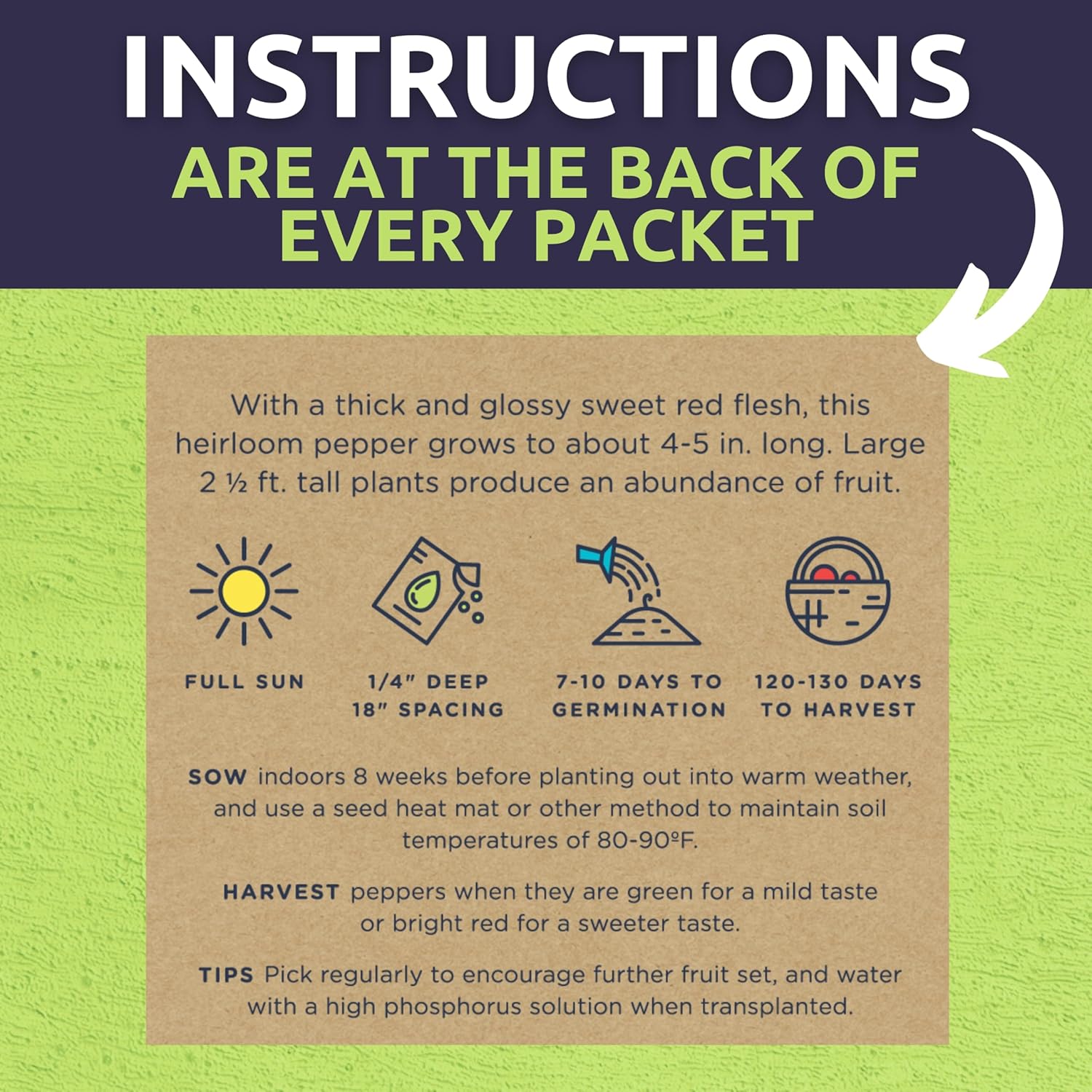 • PEPPERS - SWEET SEED PACK: Add a burst of color and sweetness to your garden! This 6-pack features vibrant varieties like Golden Cal Wonder, Purple Beauty, and Marconi Red. Perfect for snacking, salads, and grilling. Grow your own sweet pepper rainbow!