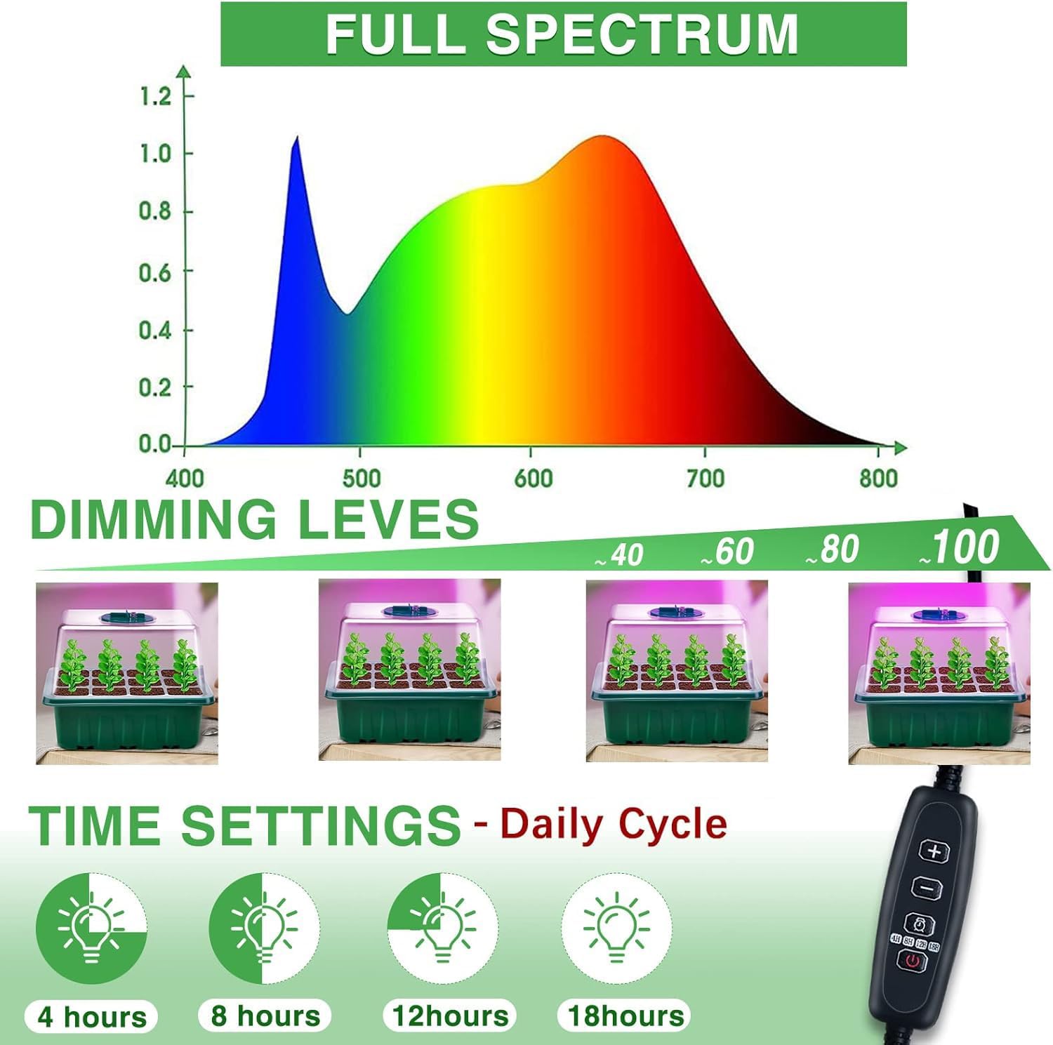 • Full Spectrum LED Plant Lights: Each seed starter tray has 8 LED grow lights that provide full-spectrum light that acts like natural sunlight to accelerate the indoor growth of seedlings, perfect for plants at all stages of growth.