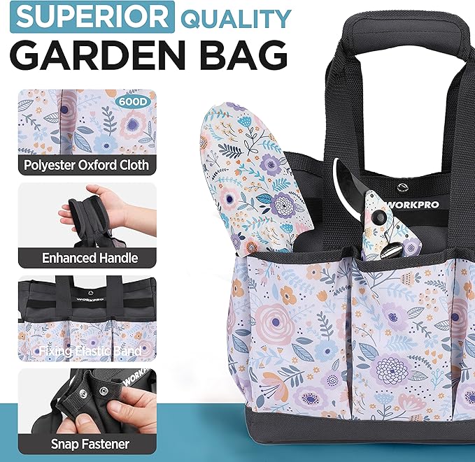 • IMPROVED GARDEN STORAGE BAG- This garden bag is made of high quality 600D polyester fabric lining with soft materials, which is very soft and durable. The bottom of this bag is reinforced with PE board, keeping the tool bag upright, more stable and not deformed. The anti-slip strap handle is comfortable and soft, reducing fatigue when carrying. Interior size of 12''x 12'' x 6'' and multi-pockets design provides enough space for storage