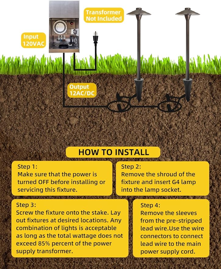 • Low Voltage Path Light: This brass low voltage landscape path lights fixture is ETL Listed to guarantee customers' safety, no worrying about fire hazard. Operating at a 12V AC/DC working voltage, it is safe for children and pets in the surrounding area. This walkway light must be powered by a 12-24V low voltage transformer (not included).