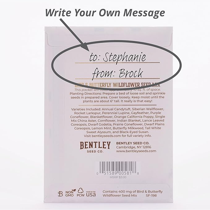 • GROW GOOD THINGS: At Bentley Seeds, we pride ourselves on providing consistent and high-quality flower seeds. Bentley Seed Co. offers multiple packet sizes, paper choices, and many seed varieties to accommodate any event. All of our favor packets comply with USDA and all 50 States Dept. of Agriculture guidelines. Packet size: 3 ¼" x 4 ½".