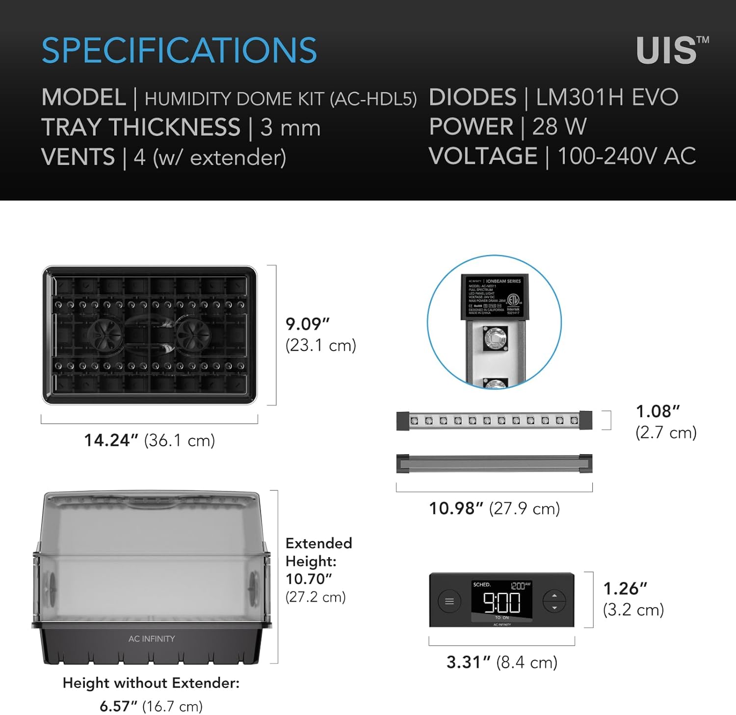 AC Infinity Heavy-Duty Humidity Dome with Full Spectrum LED Grow Light Bars, Samsung LM301H EVO Diodes, 3mm Thickest Dome and 5x8 Trays, Vent Extension Panels, for Seed Starting and Propagation