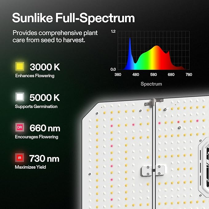 • Low Cost & Full-spectrum Sunlike Lighting: Optimal light spectrum (380-780nm, 660nm, 3000K, 5000K) for better blooms and max PAR at various distances; Better spectrum improves germination rates, blooming times, plant production, and canopy penetration at 200W