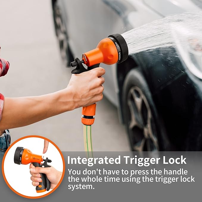 • LABOR-SAVING DESIGN: AUTOMAN garden nozzle features a nice lock bar at the top of the handle that keeps the water remains on without you having to apply any pressure.Just use the lock so you don't have to keep your hand holding it the whole time.
